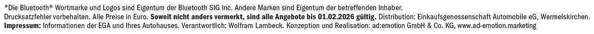 ** Die angegebenen Werte wurden nach dem vorgeschriebenen Messverfahren (WLTP) ermittelt. Die Angaben beziehen sich nicht auf ein einzelnes Fahrzeug und sind nicht Bestandteil des Angebots. Sie dienen allein Vergleichszwecken zwischen verschiedenen Fahrzeugtypen. Der tatsächliche Kraftstoffverbrauch und die CO₂-Emissionen eines Fahrzeugs hängen nicht nur von der effizienten Ausnutzung des Kraftstoffs durch das Fahrzeug, sondern auch vom Fahrstil, den Straßenverhältnissen und anderen nichttechnischen Faktoren ab. CO2 ist das für die Erderwärmung hauptsächlich verantwortliche Treibhausgas. Weitere Informationen zum offiziellen Kraftstoffverbrauch und den offiziellen spezifischen CO2-Emissionen neuer Personenkraftwagen können dem 'Leitfaden über den Kraftstoffverbrauch, die CO2-Emissionen und den Stromverbrauch neuer Personenkraftwagen' entnommen werden, der an allen Verkaufsstellen und bei http://www.dat.de unentgeltlich erhältlich ist. Für weitere Informationen siehe Pkw - Energieverbrauchskennzeichnungsverordnung – Pkw-EnVKV.